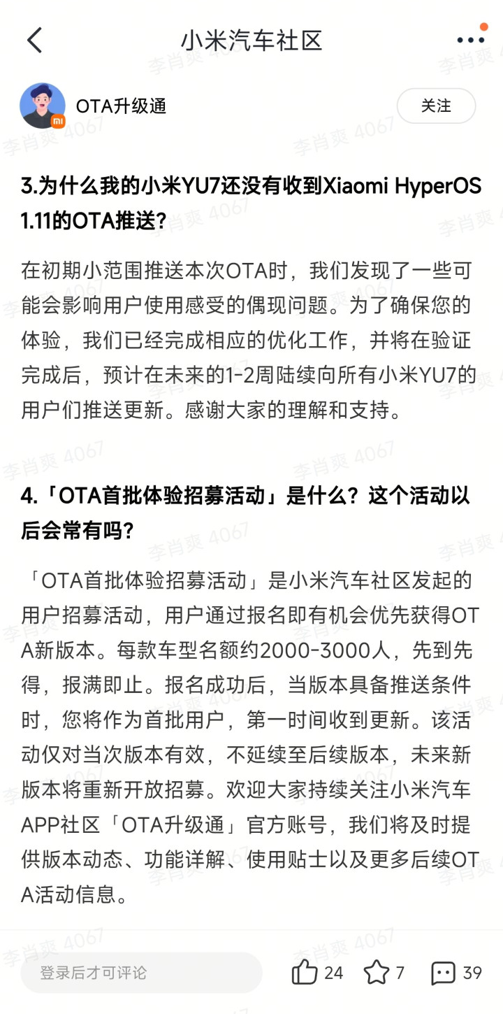 为什么我的小米YU7还没有收到XiaomiHyperOS1.11的OTA推送?